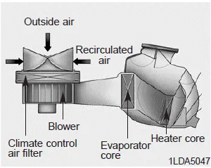 The climate control air filter installed behind the glove box, filters dust or other pollutants that come into the vehicle from the outside through the heating and air conditioning system. If dust or other pollutants accumulate in the filter over a period of time, air flow from the air vents may decrease, resulting in moisture accumulation on the inside of the windshield even when the outside (fresh) air position is selected. If this happens, have the climate control air filter replaced by an authorized Kia dealer.