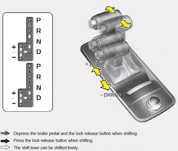 To move up a steep grade from a standing start, depress the brake pedal, release the parking brake, and shift the shift lever to D (Drive). Depress the accelerator gradually while releasing the brake pedal.