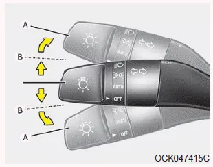 To signal a lane change, move the turn signal lever slightly and hold it in position (B). The lever will return to the OFF position when released.