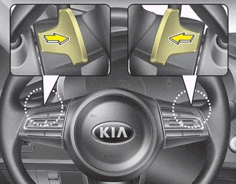 When the vehicle speed is lower than 7 km/h (4.3 mph), if you don't press the accelerator pedal for more than 6 seconds. (Except drive mode (SPORT, CUSTOM)). For more information, refer to Drive mode integrated control system in chapter 5 or if you shift the shift lever from D (Drive) to manual mode and shift it from manual mode to D (Drive) again or if you pull the [+] paddle shifter more than 1 second, the system changes from manual mode to automatic mode.