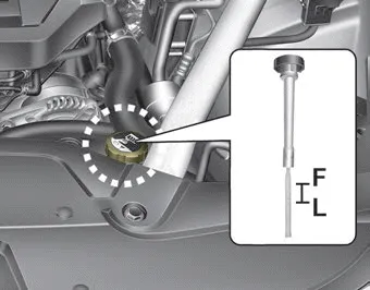The coolant level should be filled between F and L marks on the coolant level gauge when the engine is cool.